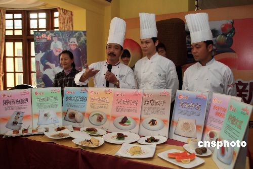 11月21日,被視為吸引大陸客“金字招牌”的臺灣“蔣家菜”,在蔣宋聯(lián)姻的上!皭蹚]”旁的一餐廳高調(diào)亮相。來自臺灣桃園的大廚,在此一展寶島版“蔣家菜”的正宗烹調(diào)功夫!笆Y家菜”菜譜是海蜇絲筍、雪菜百葉毛豆、家常豆干、白菜獅子頭、沙參玉竹燉雞湯、無錫嫩子排、蒜子燒黃魚、雞油炒飯、養(yǎng)生牛肉茶、烤奉化芋頭、檸檬木瓜。美味佳肴涵蓋蔣介石的偏愛、蔣緯國喜好以及宋美齡的美容養(yǎng)生。據(jù)悉,正宗的一份桃園“蔣家菜”套餐,約合新臺幣五百元左右,針對大陸團,當?shù)匾淹瞥龈鞣N優(yōu)惠。中新社發(fā) 潘索菲 攝