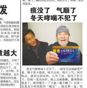 “患友介紹我服用了‘藏克’。服完第一盒,咳嗽、胸悶就緩解多了!弊蛱(22日),看著我市(重慶市)某報(bào)上的一則藥品廣告,90歲高齡的老人張治欽感到納悶,“我從來沒得過這病,卻上了該藥的宣傳廣告!