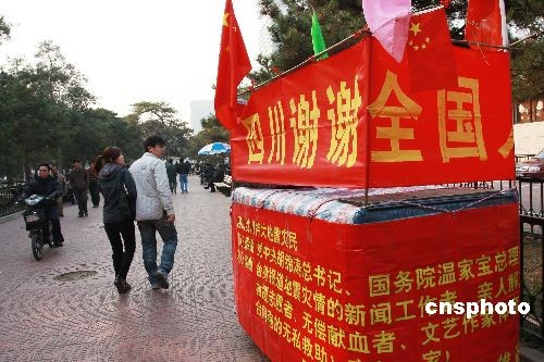 11月24日,四川汶川特大地震災(zāi)區(qū)災(zāi)民寫給全國人民的感謝信亮相北京街頭,巨型橫幅標(biāo)語吸引不少路人的目光。中新社發(fā) 鄭雄增 攝
