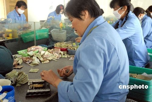 昆明公交公司共有196條無(wú)人售票公交線路,3200臺(tái)公交車,今年以來(lái),平均每月都會(huì)收到近10萬(wàn)元的假硬幣,僅此一項(xiàng)公交公司每年就要虧100多萬(wàn)。圖為昆明公交公司收銀中心點(diǎn)鈔員正在點(diǎn)鈔。中新社發(fā) 蔣晨 攝