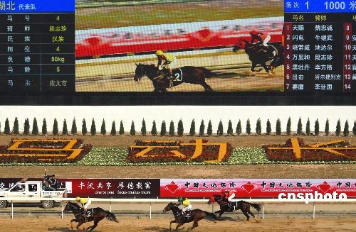 2008年11月26日,2008全國(guó)速度賽馬錦標(biāo)賽在湖北武漢市東方馬城揚(yáng)鞭開賽。前來(lái)觀看比賽的市民和馬迷們驚喜地發(fā)現(xiàn),一座巨型的全彩電視顯示大屏不僅能實(shí)時(shí)地直播現(xiàn)場(chǎng)賽況,還能不斷地滾動(dòng)播出各種賽事信息圖文,讓現(xiàn)場(chǎng)觀眾能在第一時(shí)間了解賽事進(jìn)程和享受最佳比賽視覺(jué)。中新社發(fā) 楚天行 攝
