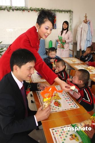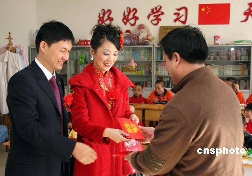11月29日,身在廣東公安系統(tǒng)工作的梁智、王文星兩位新婚警察夫婦在河北滄州老家舉辦婚禮,他們決定把親友送的婚禮紅包禮金15888元分別捐獻(xiàn)給四川地震災(zāi)區(qū)和滄州市福利保障院的智障兒童。結(jié)婚典禮結(jié)束后,這對(duì)新婚夫婦驅(qū)車前往福利院看望兒童,并向當(dāng)?shù)孛裾块T捐獻(xiàn)了自己的結(jié)婚紅包禮金。中新社發(fā) 楊志濤 攝