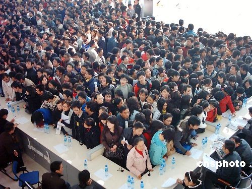 貴陽市某人力資源市場舉行的首場招聘會上,前來求職的返鄉(xiāng)農(nóng)民工和大學生擠滿了整個人才市場。經(jīng)過精心籌備,使當天進場招聘的單位達80余家,提供保安、保潔、廚師、服務員、焊工、建筑等崗位800多個。由于近段時間從外省返鄉(xiāng)的農(nóng)民工不斷增多,即將畢業(yè)的大學生和社會失業(yè)人員的求職需求也比較大,使得當天的招聘會異;鸨,進場招聘和求職的人員達到數(shù)千人,將人才市場擠得水泄不通。中新社發(fā) 彭年 攝