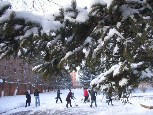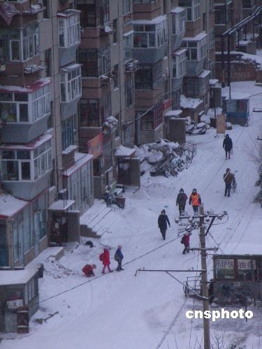 2008年12月4日,齊齊哈爾市再次降雪,城市銀裝素裹。當?shù)貧庀笈_發(fā)布藍色寒潮預(yù)警信號,提醒市民做好預(yù)防寒潮準備。齊齊哈爾市已經(jīng)連續(xù)兩天降雪,降雪給城市交通帶來了不便,車輛紛紛緩行,市民忙著清掃道路上的積雪。中新社發(fā) 王云龍 攝