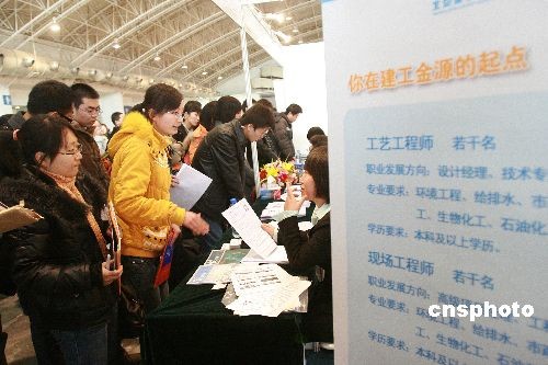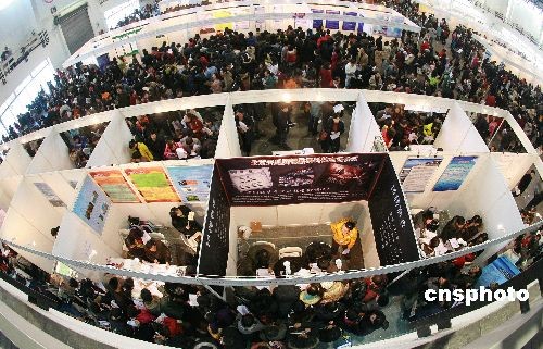 12月14日,2009年北京地區(qū)畢業(yè)研究生專場供需見面、雙向選擇招聘會在中國國際展覽中心舉辦,本次招聘會有700余家單位參會,提供14228個崗位,其中碩士學(xué)歷需求人數(shù)占總需求人數(shù)的92.4%,博士學(xué)歷需求人數(shù)占總需求人數(shù)的7.6%。據(jù)介紹,當(dāng)日參加招聘會的研究生免費入場,僅上午已經(jīng)有兩萬多名研究生前來應(yīng)聘。中新社發(fā) 陳曉根 攝