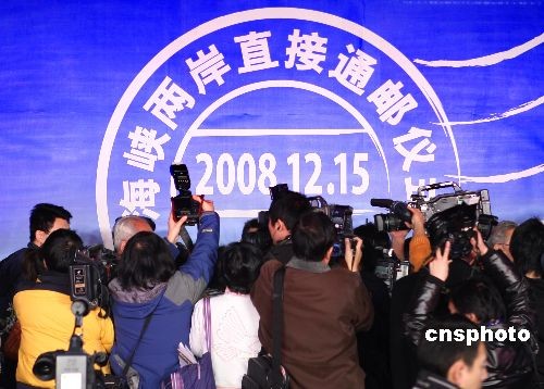 12月15日,由國家郵政局、國務(wù)院臺(tái)灣事務(wù)辦公室、北京市政府主辦、中國郵政集團(tuán)承辦的海峽兩岸直接通郵儀式,標(biāo)志著海峽兩岸將實(shí)現(xiàn)全面、直接、雙向通郵,直接開辦各項(xiàng)郵政業(yè)務(wù)。大陸方面郵件封局為北京、上海、廣州、福州、廈門、西安、南京、成都,臺(tái)灣方面郵件封局為臺(tái)北、高雄、基隆、金門、馬祖。圖為通郵儀式吸引眾多境內(nèi)外記者爭相采訪。中新社發(fā) 宋吉河 攝