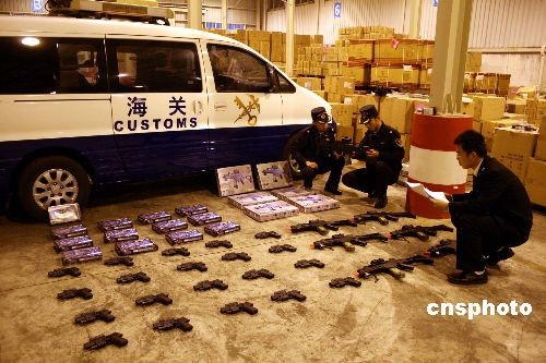近日,寧波海關(guān)在貨運渠道查獲512支國家禁止進(jìn)出境仿真槍,目前該批仿真武器已移交有關(guān)部門處理。據(jù)了解,該批仿真槍外殼為黑色硬塑料,部分內(nèi)部機(jī)件為金屬制,槍支彈匣、瞄準(zhǔn)器、消音器、紅外鐳射燈、BB彈等配件一應(yīng)俱全。中新社發(fā) 何蔣勇 攝