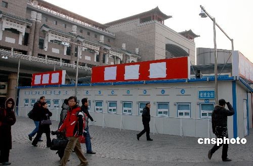 12月26日,北京西站廣場(chǎng)上搭建起“臨時(shí)售票窗口”,為2009年春運(yùn)做準(zhǔn)備。2009年春運(yùn)將從元月11日至明年2月19日結(jié)束,為期40天。今年春運(yùn)的特點(diǎn)是學(xué)生流和民工流探親流三流重疊,春運(yùn)壓力空前集中。針對(duì)近日來迅猛增長(zhǎng)的節(jié)前客流,為方便旅客購票,春運(yùn)期間北京站和西站會(huì)將在站前廣場(chǎng)開辟臨時(shí)售票窗口,方便旅客購票。中新社發(fā) 鄭雄增 攝