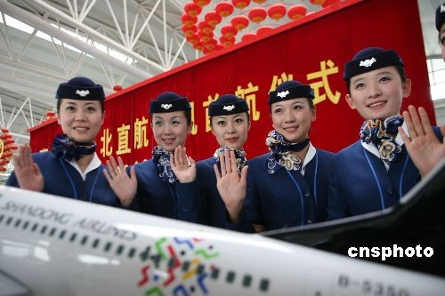 十二月二十六日下午三點(diǎn),青島-臺(tái)北直航班機(jī)從青島流亭國際機(jī)場起飛,駛向臺(tái)北桃園國際機(jī)場,拉開青島臺(tái)北兩市直航的序幕。此后,每周二、周五各有一班常態(tài)包機(jī)航班從青島直飛臺(tái)北。青島臺(tái)灣直航后,旅程由原來七個(gè)小時(shí)縮短到兩個(gè)半小時(shí),費(fèi)用節(jié)約百分之三十,實(shí)現(xiàn)兩岸一日生活圈的夢想。圖為在首航直飛包機(jī)航班上服務(wù)的部分乘務(wù)人員在慶祝直航儀式上。中新社發(fā) 王群 攝
