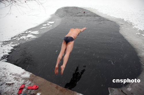 12月下旬,沈陽市北陵公園人工湖,一批冬泳愛好者換上泳衣,在刺骨的寒風(fēng)中面對(duì)泛著冰碴的湖水一躍而下演繹出美麗“凍”人的一幅畫面。一名老冬泳愛好者告訴記者,冬泳開始練習(xí)時(shí)難免有些困難要克服,但克服困難后的樂趣是普通人無法體會(huì)的,“希望更多的年輕人加入到這個(gè)隊(duì)伍中,可以鍛煉我們整個(gè)民族的意志!敝行律绨l(fā) 黃金昆 攝