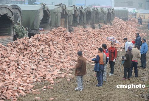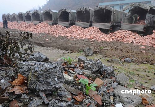 2009年元旦節(jié),解放軍成都軍區(qū)重返地震災(zāi)區(qū)的運(yùn)輸部隊(duì)冒著余震小雨,從重慶為重災(zāi)區(qū)北川縣曲山鎮(zhèn)災(zāi)民無償運(yùn)來重建家園急需的紅磚。中新社發(fā) 賈國榮 攝