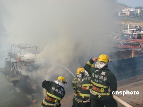 1月3日13時20分許,廣西梧州桂江上一艘貨船突然起火。由于火勢大,貨船噴出的火苗很快點燃?吭谂赃叺牧硪凰邑涊,并危及鄰近10多艘貨輪。梧州消防支隊調(diào)集水上中隊和河?xùn)|中隊官兵奮戰(zhàn)近50分鐘,終于將大火撲滅,事故中無人員傷亡。據(jù)了解,當(dāng)時起火貨船靠岸后船主上岸辦事,不料隨后船艙起火。中新社發(fā) 何永崇 攝