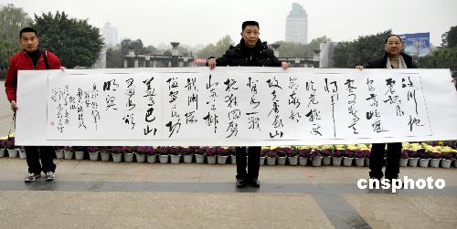 1月5日,一幅飽含地震災(zāi)區(qū)群眾深情的巨幅詩詞書法作品《唐家山頌》在四川省南充市創(chuàng)作完成。這幅作品寬5.12米,高0.8米,由南充市退休干部張體政撰稿,書法家何文軍以草書體創(chuàng)作成傳統(tǒng)書法藝術(shù)卷軸,以表達(dá)地震災(zāi)區(qū)群眾對廣大解放軍指戰(zhàn)員和武警官兵抗震救災(zāi)英雄壯舉的感激和敬仰之情。張體政、何文軍即專程把這幅飽含地震災(zāi)區(qū)群眾深情的詩詞書法作品送往北京。圖為飽含地震災(zāi)區(qū)群眾深情的詩詞書法作品《唐家山頌》。中新社發(fā) 肖洪環(huán) 攝