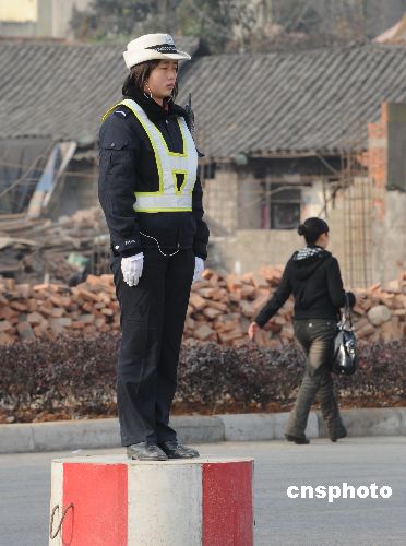 一名女警在四川大地震重災(zāi)區(qū)的北川縣安昌鎮(zhèn)街頭上崗指揮交通。北川縣城被大地震摧毀后,縣機(jī)關(guān)轉(zhuǎn)移此地辦公,將于2009年春節(jié)后開(kāi)始新北川城的建設(shè)。中新社發(fā) 賈國(guó)榮 攝