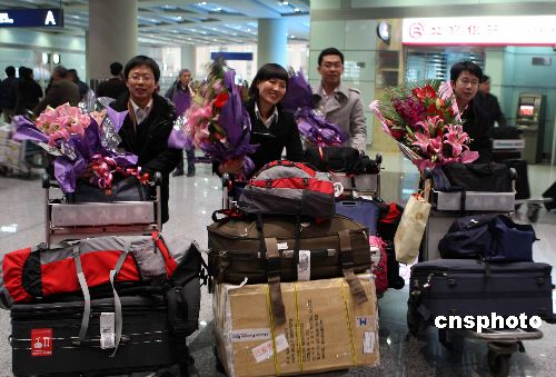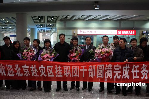 一月七日,四位赴四川汶川地震的團干部返京。自5.12四川汶川地震發(fā)生后,北京市共派出十九批二百六十余名志愿者等奔赴災區(qū),與當?shù)孛癖姴⒓鐘^戰(zhàn)。中新社發(fā) 任海霞 攝
