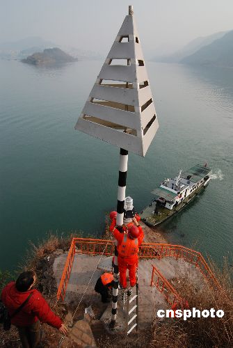 2009年1月8日,在三峽重慶庫區(qū)云陽段,航道管理人員在安裝新型太陽能航標燈。這種航標燈集太陽能光板、蓄電池、燈具于一體,視距更長、靈敏度更高、耐用性更好,可有效解決三峽庫區(qū)江面增寬和霧氣較大給船舶航行帶來的影響。目前,三峽庫區(qū)航道管理部門正在陸續(xù)更換,僅云陽縣就有30只新型太陽能航標燈在春運期間投入使用。中新社發(fā) 劉小洋 攝