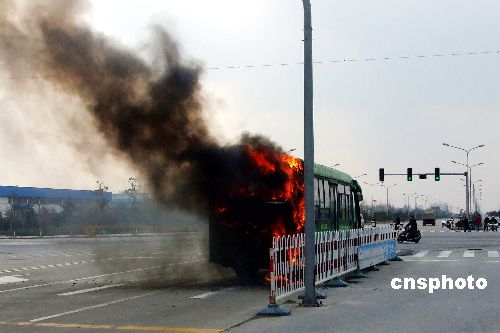 2009年1月9日下午兩時(shí),江蘇鹽城市區(qū)一20路公交車(chē)行駛到鹽瀆路與西環(huán)路交界處發(fā)生自燃,當(dāng)時(shí)車(chē)內(nèi)有七八名乘客,由于疏散及時(shí),并沒(méi)有造成人員傷亡,火也被消防人員及時(shí)撲滅,車(chē)輛卻受損嚴(yán)重,公交部門(mén)初步斷定起火原因是電路故障。中新社發(fā) 李根 攝