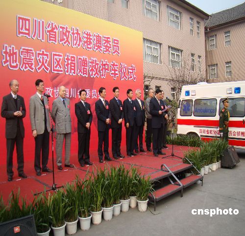 1月14日,參加政協(xié)四川省十屆二次會(huì)議的港澳委員向地震災(zāi)區(qū)捐贈(zèng)了一批救護(hù)車,用以改善地震災(zāi)區(qū)受贈(zèng)醫(yī)療機(jī)構(gòu)醫(yī)療衛(wèi)生設(shè)備缺乏現(xiàn)狀。圖為救護(hù)車捐贈(zèng)儀式現(xiàn)場。中新社發(fā) 王萌 攝
