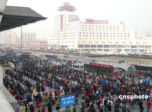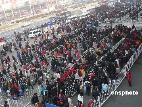 2009年1月21日,北京西站人頭攢動(dòng)、旅客如織。據(jù)北京西站方面透露,根據(jù)車(chē)次的售票情況看,21日單日上車(chē)客流將超過(guò)23萬(wàn)人次,達(dá)到本次春運(yùn)節(jié)前的峰值。中新社發(fā) 玉龍 攝