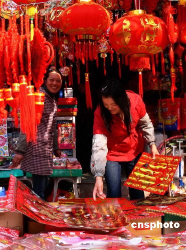 1月22日,廣西桂林商業(yè)步行街,市民在挑選年貨,選購(gòu)新年飾品。春節(jié)臨近,桂林各大商場(chǎng)貨源充足,購(gòu)銷兩旺,洋溢著濃濃的節(jié)日氣氛。中新社發(fā) 姜純 攝