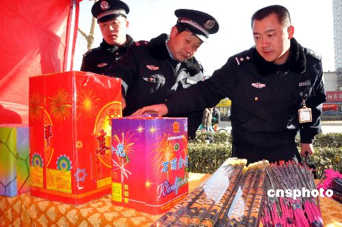 1月23日,為確保春節(jié)安全,鄭州市公安局金水分局組織治安、消防大隊、轄區(qū)派出所,全面展開對煙花爆竹違規(guī)燃放、販運和銷售煙花進行嚴(yán)格檢查。截至目前,共清查集貿(mào)市場、街道鄉(xiāng)村攤點317余處。中新社發(fā) 劉書亭 攝