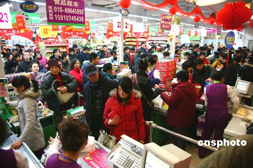 1月24日,北京市懷柔區(qū)“年貨”市場(chǎng)人潮涌動(dòng),市民紛紛走進(jìn)食品超市選購(gòu)年貨,呈現(xiàn)出紅紅火火過(guò)大年的喜慶景象。中新社發(fā) 卜向東 攝