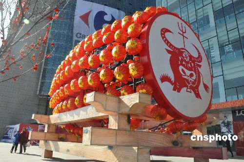 1月25日是農(nóng)歷大年三十,在鄭州市花園北路新瑪特廣場(chǎng),矗立起一座高8米、長8.5米、由280個(gè)大紅燈相連所組成的“巨型迎春鼓燈”。中新社發(fā) 劉書亭 攝