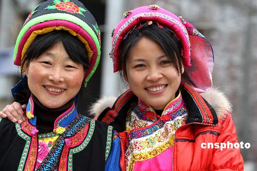 1月26日農(nóng)歷牛年第一天,5·12地震重災(zāi)區(qū)四川省北川縣擂鼓鎮(zhèn)羌族女中學(xué)英語教師謝紅霞(左)穿上民族節(jié)日盛裝到各個羌族村寨看望她的學(xué)生和家長。去年地震發(fā)生時,謝紅霞與全體教師沉著鎮(zhèn)靜地將所有學(xué)生保護到安全地帶,學(xué)生與家長們由衷地感謝這些教師。中新社發(fā) 任晨鳴 攝