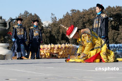 1月26日農(nóng)歷正月初一,第24屆地壇春節(jié)文化廟會(huì)如期舉行,廟會(huì)歷時(shí)8天,至2月1日截止。每年地壇廟會(huì),地壇公園芳澤壇都會(huì)舉行場(chǎng)面宏大的仿清祭地表演,“皇帝”帶領(lǐng)文武百官、侍衛(wèi)儀仗等200余人身著盛裝祭祀,祈求地神保佑、國泰民安、風(fēng)調(diào)雨順、五谷豐登,今年的祭地表演則因?yàn)椤安莞实邸钡暮_x而備受關(guān)注。從普通市民中遴選出來的“草根皇帝”李少華正式上任,迎神送神、三叩九拜,在數(shù)百游園觀眾的注視下,黃袍加身的李少華邁著堅(jiān)定的步伐,完成了一次皇家禮儀文明之旅。中新社發(fā) 富田 攝