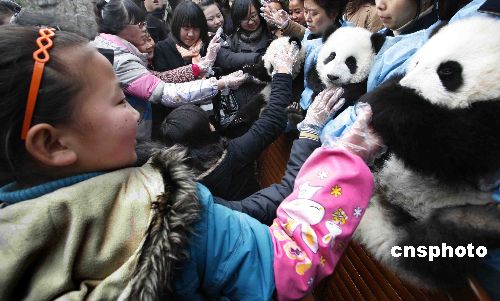 1月17日,中國農(nóng)歷大年初二,來自都江堰的十七名因汶川大地震新增的“三孤”人員,受邀來到成都大熊貓繁育研究基地:參觀大熊貓產(chǎn)房、品嘗大熊貓專用“窩頭”、和大熊貓親密接觸合影留念……度過了一個獨具意義的春節(jié)。圖為孩子們與大熊貓親密接觸。中新社發(fā) 張全能 攝