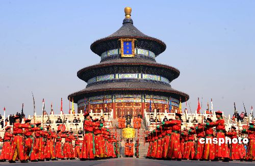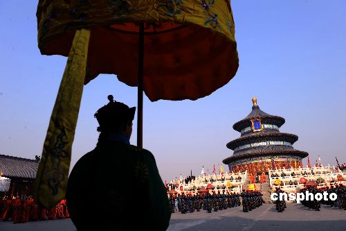 1月28日,北京天壇的祭天盛典。北京天壇公園從農(nóng)歷大年初一至初五推出祭天樂舞和儀仗展演。演出陣容包括祭天樂舞239人和祭天儀仗280人,演出現(xiàn)場和周邊主要道路有五彩龍旗、云旗、刀旗等1500面,懸掛燈籠1000只,吸引大批中外游客前往觀禮。中新社發(fā) 廖攀 攝