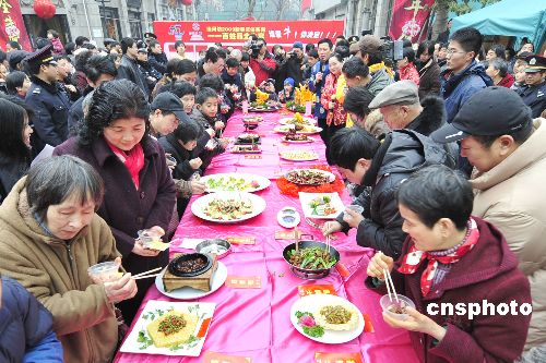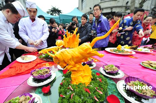 1月29日,杭州清河坊歷史街區(qū)舉辦“全牛宴”展評(píng)活動(dòng),街區(qū)內(nèi)十余家老字號(hào)餐飲業(yè)名店推出與“!庇嘘P(guān)的各式創(chuàng)新菜肴,由現(xiàn)場(chǎng)市民百姓品嘗并評(píng)選出“最牛”菜肴,展示老字號(hào)企業(yè)以創(chuàng)新創(chuàng)意迎牛年牛市的自信姿態(tài)。 中新社發(fā) 李忠 攝