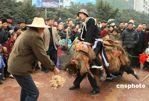 1月30日,農(nóng)歷正月初五,四川省洪雅縣瓦屋山鎮(zhèn)復(fù)興村84歲村民毛清全帶領(lǐng)該村10多名村民,到眉山市城區(qū)表演當(dāng)?shù)孛袼住芭簾簟薄?/p>