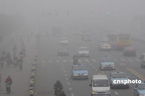 2009年2月1日,江蘇淮安街頭被大霧籠罩。當(dāng)日是節(jié)后上班的第一天,也是農(nóng)民工返城的高峰期,大霧給春運(yùn)產(chǎn)生一定的影響。中新社發(fā) 賀敬華 攝