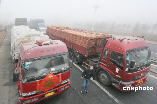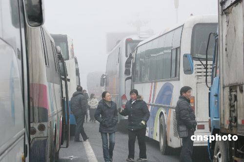 2009年2月1日上午,在同三高速公路江蘇省贛榆縣出口處,車輛等待霧散通行。連日來,江蘇省大部分地區(qū)遭遇持續(xù)大霧天氣,部分地區(qū)能見度不足50米,給旅客出行及運輸帶來影響。當?shù)貧庀蟛块T發(fā)布大霧黃色預警,交通安全部門提醒旅客要注意出行安全。中新社發(fā) 司偉 攝