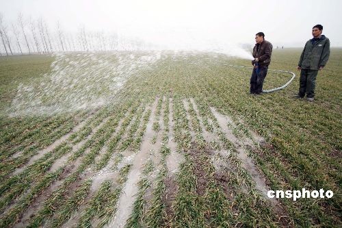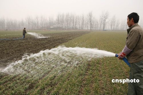 2月3日,安徽蒙城縣許疃鎮(zhèn)趙集村村民在澆灌麥田。2月2日,安徽蒙城氣象臺再次發(fā)布干旱紅色預(yù)警信息,針對當前日益嚴重的旱情,安徽省蒙城縣再次掀起抗旱保苗的高潮,努力把旱災(zāi)損失降到最低限度。蒙城縣是全國糧食生產(chǎn)先進縣,全縣小麥種植面積達165萬畝,自10月下旬以來,該縣已連續(xù)百日無有效降雨,土壤墑情迅速下降,加上連續(xù)發(fā)生三次寒潮,干旱和霜凍疊加在一起,致使小麥苗情不斷惡化,對越冬小麥生長極其不利,形勢十分嚴峻。面對旱情,蒙城縣上下積極行動,分別于去年12月中旬、1月上、中旬三次掀起抗旱保苗高潮,努力把旱災(zāi)損失降到最低限度。中新社發(fā) 胡衛(wèi)國 攝