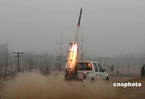 中國許多地方正在遭受嚴(yán)重干旱,各地抓住氣象條件動用人工增雨等辦法以緩解旱情。二月七日下午,安徽省出現(xiàn)有利增雨作業(yè)的天氣過程,十六時許作業(yè)飛機(jī)在蚌埠機(jī)場穿云破霧實(shí)施今年首次飛機(jī)增雨作業(yè)。八日八時、十時、十四時,人工增雨作業(yè)飛機(jī)又連續(xù)三次先后在阜陽、六安、淮北、亳州、淮南、宿州、蚌埠等皖北地區(qū)作業(yè)。同時,安徽旱區(qū)六市十四個縣和兩個區(qū)開展了次地面人工增雨作業(yè)。據(jù)統(tǒng)計,七日下午至八日十六時,安徽省已經(jīng)在干旱嚴(yán)重的皖北地區(qū)實(shí)施四駕次飛機(jī)人工增雨作業(yè),一百多次高炮火箭作業(yè),增雨面積達(dá)十萬平方公里,旱區(qū)普降三毫米以上甘霖,最大降雨量八點(diǎn)五毫米。圖為火箭人工增雨作業(yè)現(xiàn)場。中新社發(fā) 王兵 攝