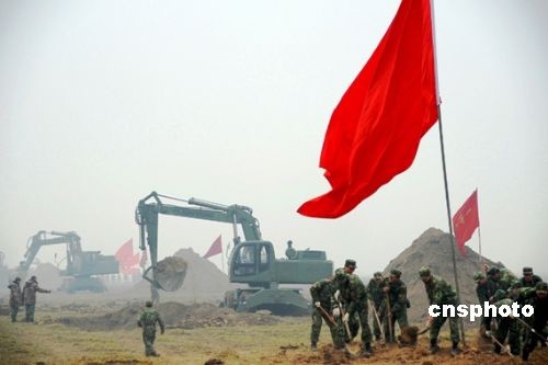 2月8日,剛剛赴蘇丹維和歸來的駐沁某部官兵正在河南省新鄉(xiāng)市封丘縣柳園口黃河灘區(qū)開挖引黃灌溉渠。據(jù)了解,駐沁某部接濟(jì)南軍區(qū)命令,于2月7日緊急馳援新鄉(xiāng)市封丘縣柳園口執(zhí)行抗旱救災(zāi)。據(jù)悉,該部將用5天時(shí)間在柳園口黃河灘開挖一條長2700米、寬18米、深3.5米,總工程量11.6萬立方米的引黃灌溉渠,渠道開通后將解決400萬畝麥田的灌溉問題。 中新社發(fā) 杜文旭 攝