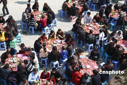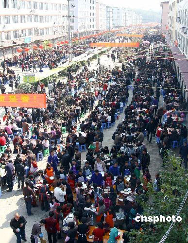 圖為位于雅陽的兩千多桌宴席。2月9日,中國傳統(tǒng)的元宵節(jié),在浙江省泰順縣,在這一天就會邀請四方的賓客相聚在洲嶺、雅陽、西旸等地。今年雅陽的“百家宴”歷史以來規(guī)模也是最大的一次,達到一千多桌,一萬多人,且和文化旅游相組合,推出了許多的節(jié)目。現在,“百家宴”已經成為一種帶有民間聯(lián)誼性質的活動,人們歡聚一堂聯(lián)絡感情,互送祝福,譜寫盛世和諧新篇章。中新社發(fā) 鎬璽 攝