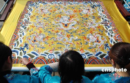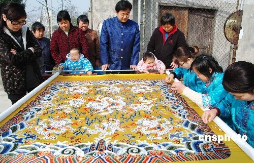 2009年2月10日,一幅長117.5厘米、寬132厘米,使用了18萬顆直徑1.3毫米珍珠“繡”制的《織繡串珍珠九龍皇墊》在蘇州高新區(qū)東渚鎮(zhèn)繡制完成。此作品由4個(gè)繡娘費(fèi)時(shí)7個(gè)月制作完成,在1.5米乘1.5米的手工云錦底布上,共使用了純金線3000米,真絲花線2000克和18萬顆珍珠。中新社發(fā) 朱子寒 攝