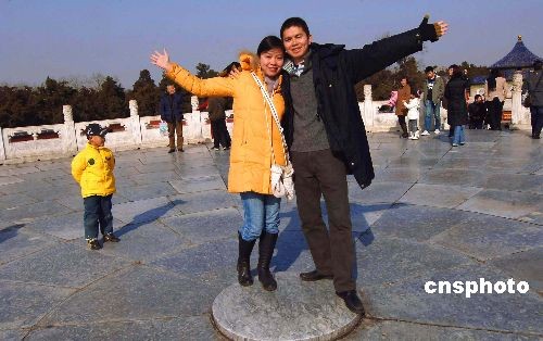 2月13日,一隊(duì)情侶來到北京天壇圜丘,在過去皇帝祭祀天地的地方祈福。日前北京降下百日干旱后的第一場(chǎng)甘霖,為情人節(jié)帶來一個(gè)溫潤(rùn)天氣。中新社發(fā) 鄒憲 攝