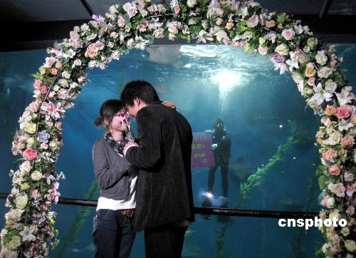 2月14日情人節(jié),上海一名女孩在神秘的“海洋世界”前瑰麗的彩花門下接受男友求婚后,相擁盡享甜蜜時光。上海海洋世界在情人節(jié)為申城情侶開啟愛情的夢幻大門,在海洋水族館巨大玻璃前設立花門,有情人紛紛在此情定終生,讓神奇的“海洋世界”為他們見證愛情。中新社發(fā) 陳靜 攝