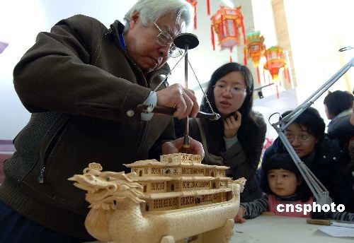 2月14日,在北京農展館舉辦的“中國非物質文化遺產傳統(tǒng)技藝大展”上,來自湖北武漢的木雕船模大師龍從發(fā),現(xiàn)場為北京觀眾表演用黃楊木制作龍鳳舟模型。中新社發(fā) 鄒憲 攝