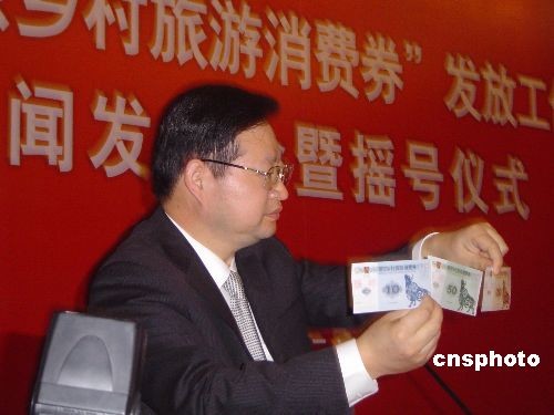 2月16日,南京市向城區(qū)居民發(fā)放2000萬元鄉(xiāng)村旅游消費(fèi)券以帶動(dòng)鄉(xiāng)村游,在市民代表和公證部門監(jiān)督下進(jìn)行公開搖號(hào),搖中的20萬戶居民每戶獲得100元旅游消費(fèi)券,可在指定的該市37個(gè)鄉(xiāng)村旅游點(diǎn)抵扣相應(yīng)消費(fèi)費(fèi)用。圖為搖號(hào)儀式上市旅游局官員展示旅游消費(fèi)券樣式。中新社發(fā) 王國(guó)安 攝