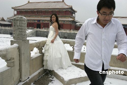 2009年2月18日,北京牛年首場春雪已持續(xù)兩天,故宮博物院紅磚碧瓦銀裝素裹。中新社發(fā) 魯谷 攝