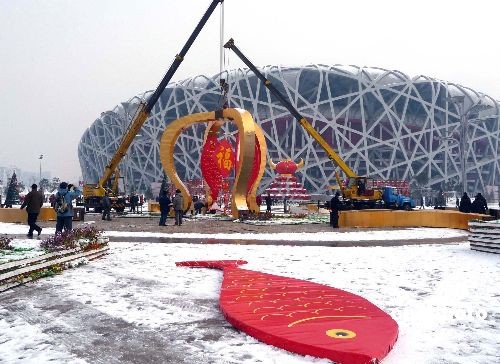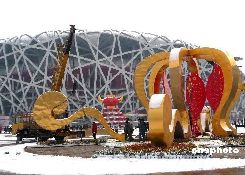 2009年2月19日,北京奧林匹克公園“鳥巢”與“水立方”之間,施工人員開始拆卸“祥云皇冠”景觀。據(jù)悉,隨著牛年春節(jié)結(jié)束,其它春節(jié)臨時(shí)景觀也將陸續(xù)拆除。中新社發(fā) 玉龍 攝