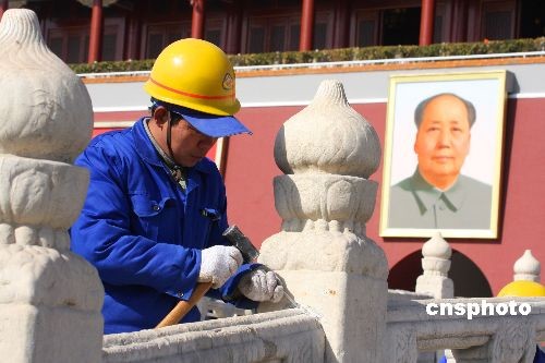 2月20日,工人正在對天安門金水橋進(jìn)行修繕。為迎接新中國成立60周年,確保游客和文物安全,從2月18日起,天安門金水橋開始實施保護(hù)修繕。據(jù)天安門地區(qū)管委會介紹,工程擬于5月1日前完工,然后整體對外開放。中新社發(fā) 吳芒子 攝