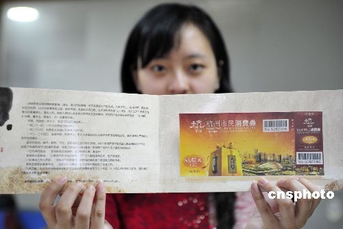 2月23日,10萬冊《杭州市市民消費券珍藏冊》在杭州公開發(fā)行。1月20日起,杭州市向全市六城區(qū)67萬特殊人群發(fā)放了1億元消費券,在過去的一個月內(nèi),已經(jīng)十分有效地達到了“保障民生,拉動消費”的目標(biāo)。在此前提下,為滿足廣大市民珍藏消費券,保存這份特殊記憶的要求,市財政部門特別制作并發(fā)行10萬冊《杭州市市民消費券珍藏冊》,每冊收藏五張“杭州市民消費券”,每張面值20元,價值100元,整冊發(fā)行價亦為100元人民幣。冊內(nèi)消費券不僅具有收藏價值,也可以憑券消費,同時享受商家提供的優(yōu)惠服務(wù)。中新社發(fā) 李忠1 攝