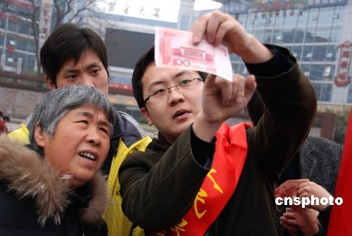 2月24日上午,反假貨幣“壁壘行動”在江蘇鎮(zhèn)江大市口廣場啟動。據(jù)悉,由中國人民銀行鎮(zhèn)江市中心支行組織全市各金融機(jī)構(gòu)以及公安部門將進(jìn)行為期三個月的反假貨幣宣傳活動,活動還將成立反假宣傳小分隊深入到社區(qū)、商場、農(nóng)貿(mào)市場、車站、農(nóng)村等地向群眾宣傳反假幣知識和相關(guān)法律常識。中新社發(fā) 封波 攝