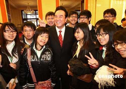 2月25日,海峽兩岸關(guān)系協(xié)會會長陳云林,在北京會見來京交流的廣東東莞臺商子弟學校董事長葉宏燈及其率領(lǐng)的該校校董和160多名師生。圖為陳云林和臺商子弟學校學生親切交流并合影。中新社發(fā) 杜洋 攝